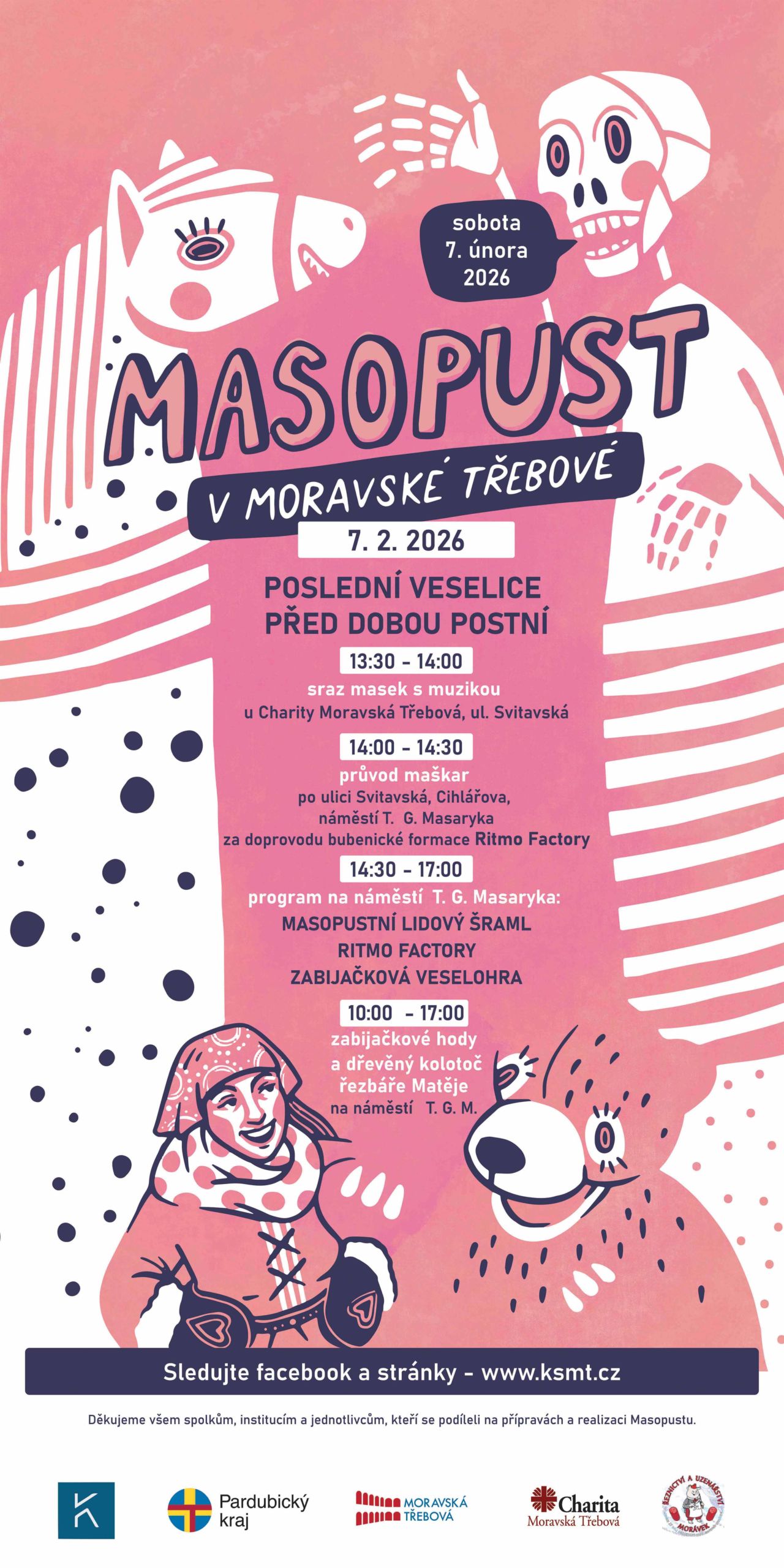 Na vědomost se dává, že se v našem městě opět uskuteční masopust! Těšit se můžete na tradiční masopustní průvod masek, hudbu, tanec, dřevěné kolotoče a spoustu masopustních dobrot.